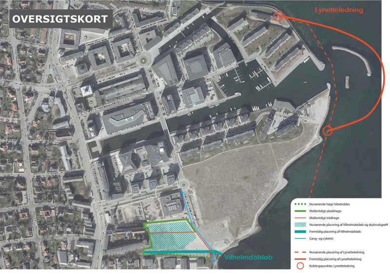 Første skridt er at omlægge den store spildevandsledning, Lynetteledningen, der servicerer et stort opland i Gentofte Kommune og leder spildevandet til Lynetten på Amager. Dette arbejde vil finde sted på land i den sydvestlige ende af grunden, hvorefter ledningen sejles ud og sænkes ned på havbunden og kobles sammen med den nuværende ledning. Der vil også foregå arbejder på land ved det nordlige koblingspunkt, før og efter ledningen sænkes ned.